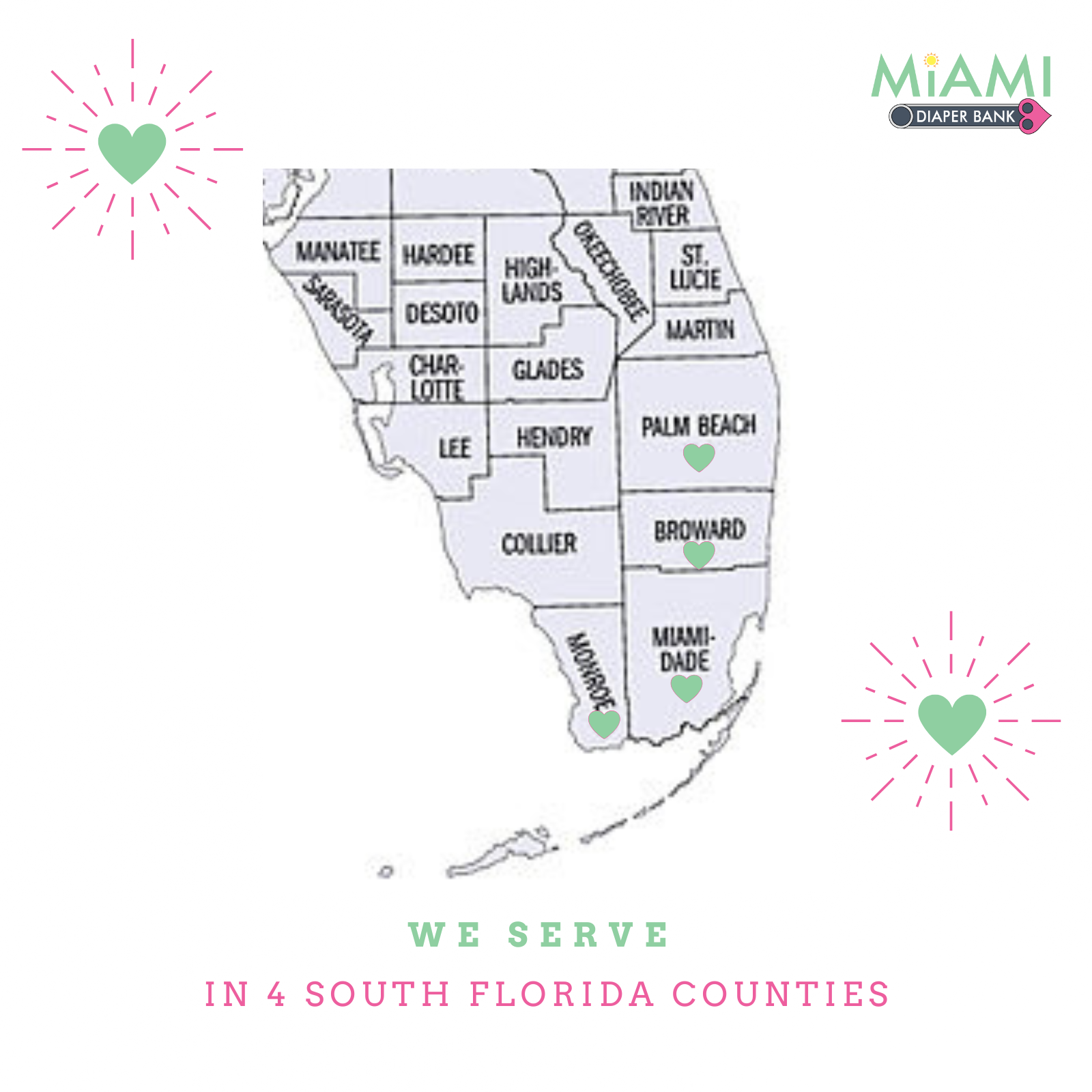 Focused in Miami-Dade County, Miami Diaper Bank expanded its service in 2017 after Hurricane Irma to Broward, Palm Beach, Collier/Lee, and Monroe counties.